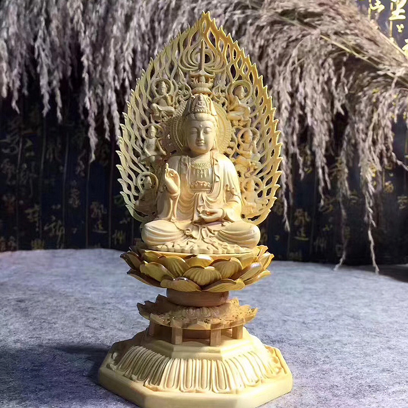 ツゲの木の観音座蓮屏風観音木彫り装飾品菩薩仏像