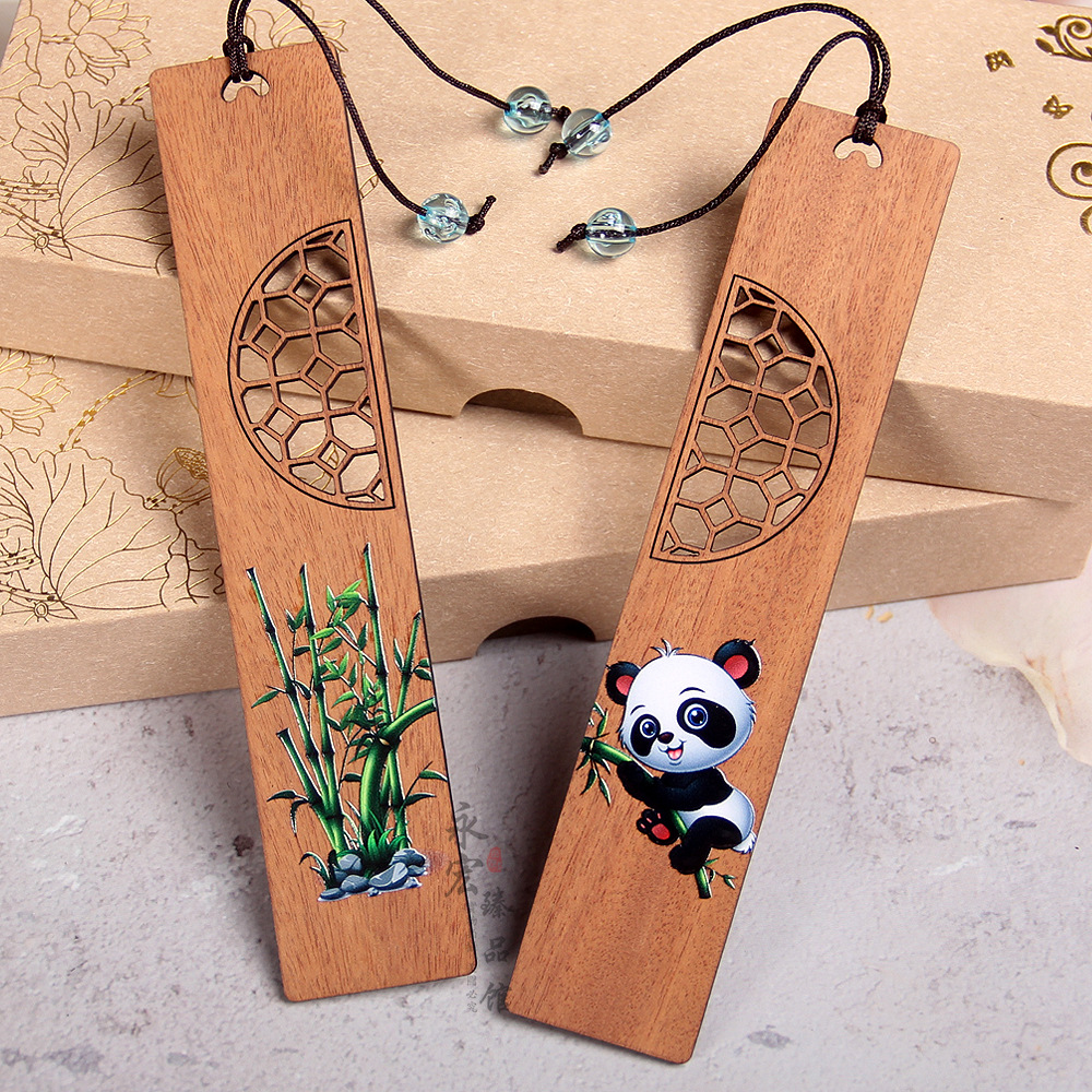 色絵金糸楠木パンダのしおりパンダ文創記念品赤木透かし彫りしおり彫刻ロゴ