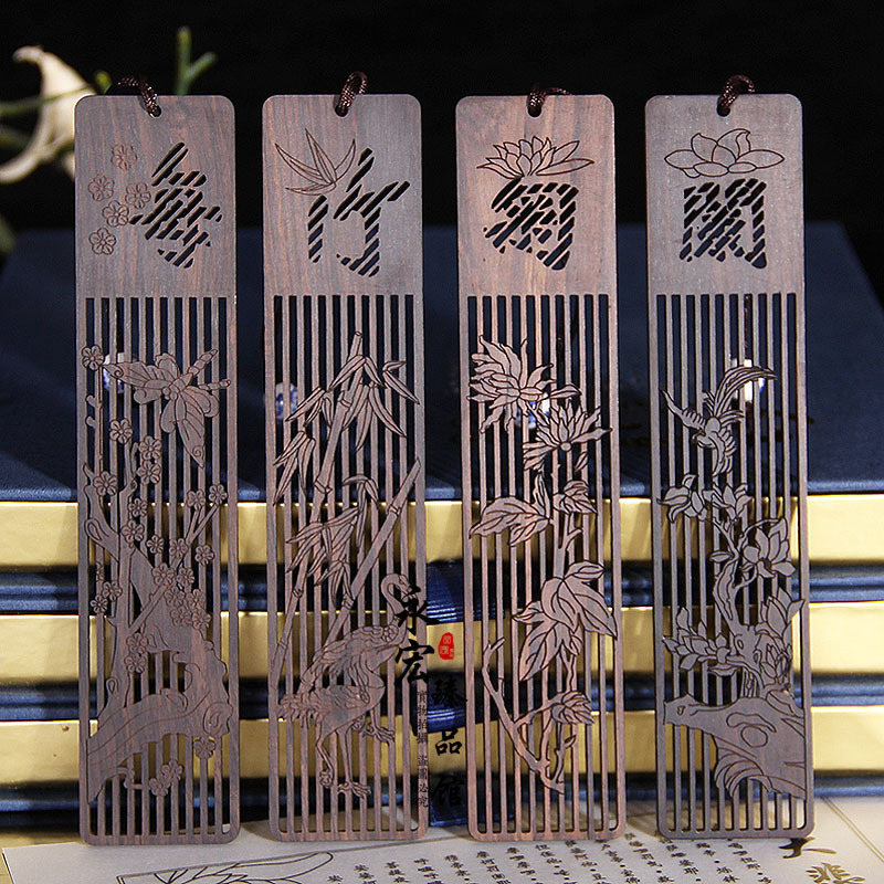 黒檀の梅蘭竹菊のしおりの赤い木のしおりの透かし彫りの梅蘭竹菊のしおりは字のlogoを刻むことができます。