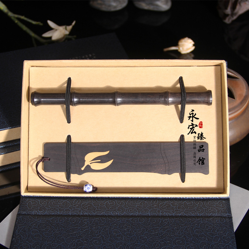 黒檀の本のサインペンセットの赤い木のしおりの彫刻のロゴの黒檀は黄色の楊木の創意のしおりを象眼します。
