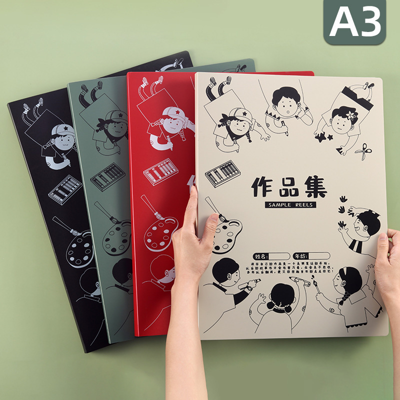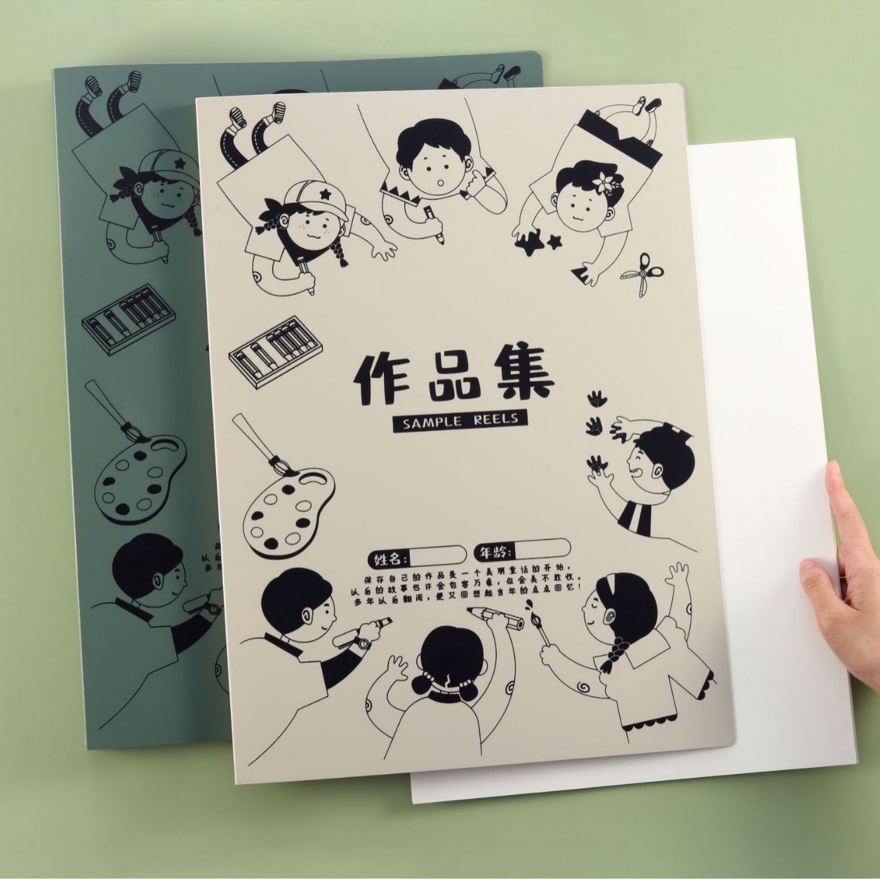 康百学生の国画美術の収納帳の画集は作品集の子供の正方形のファイルを挟んで事務的に収納します。
