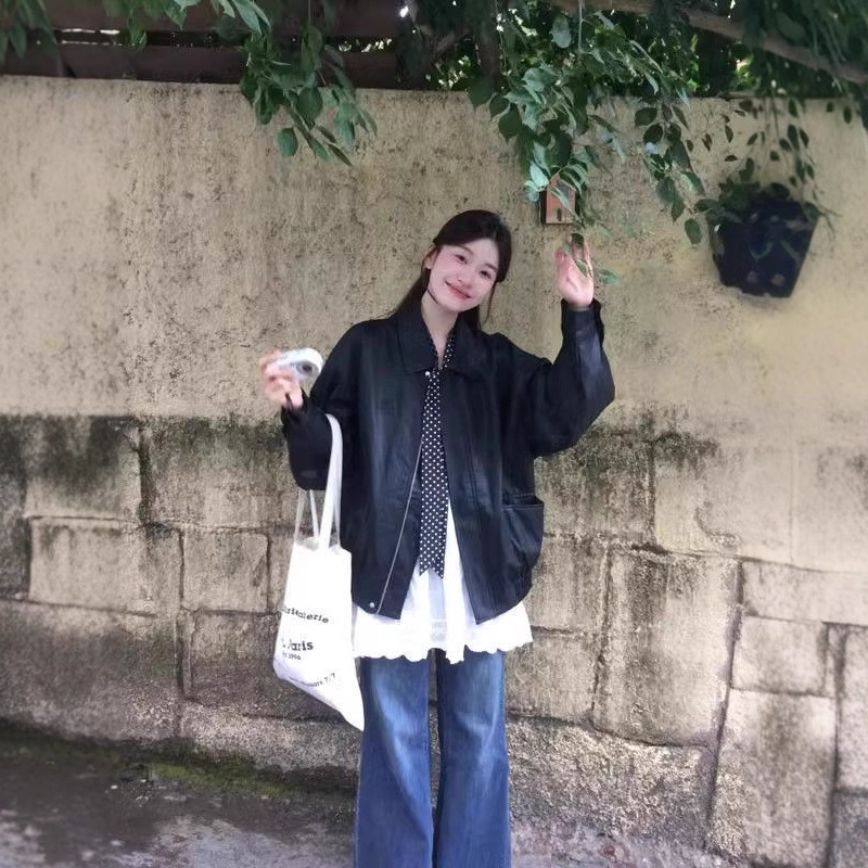 韓国スタイルのハイエンド黒長袖ジッパーレザージャケット女性のための 2025 秋の新しい気質スリムオートバイジャケット