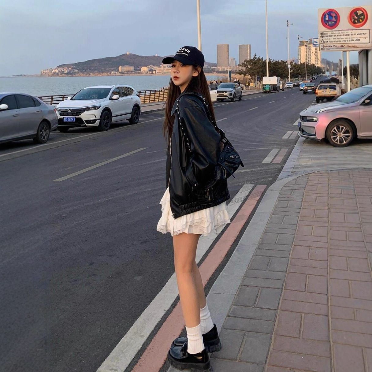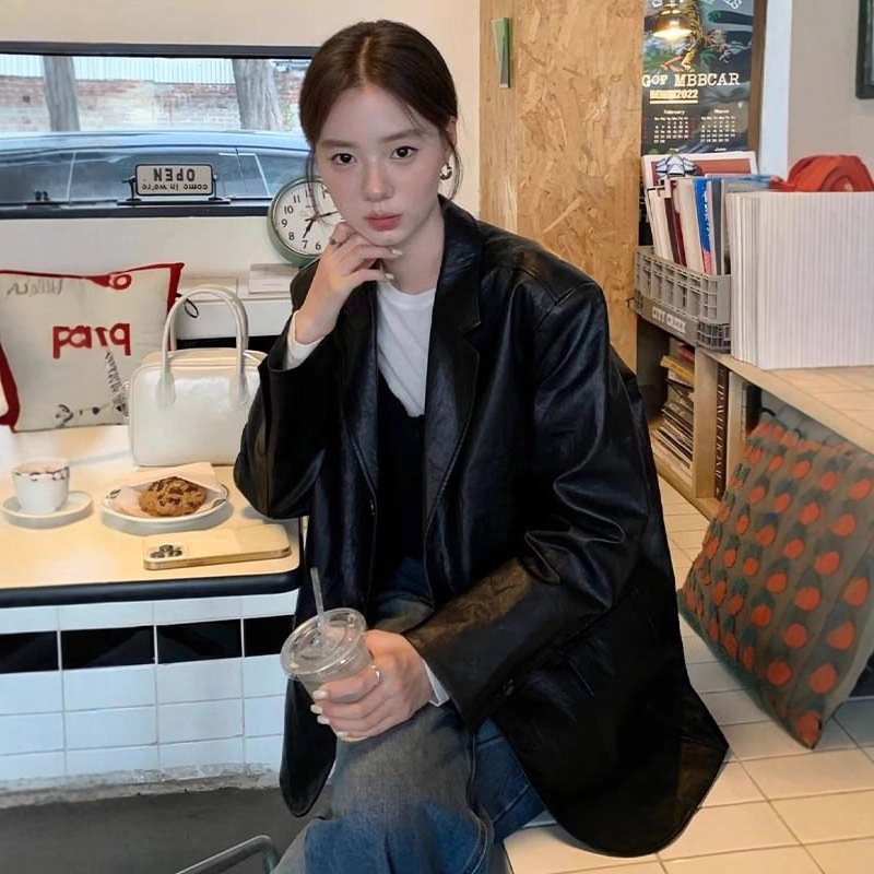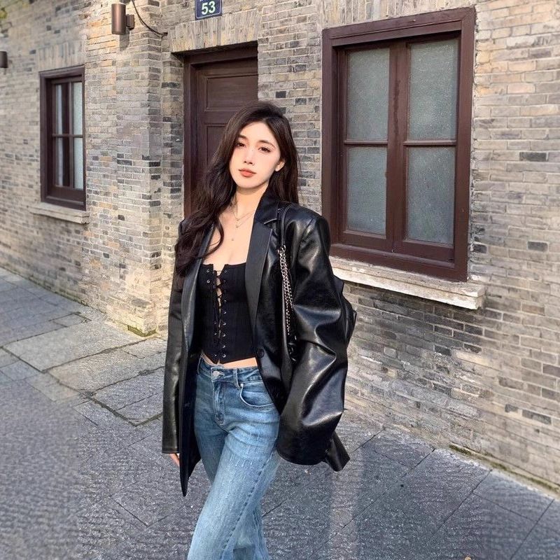 韓国のトレンディな黒の PU スーツジャケット女性のための 2025 新しいハイエンドスリムクールガールオートバイレザージャケット