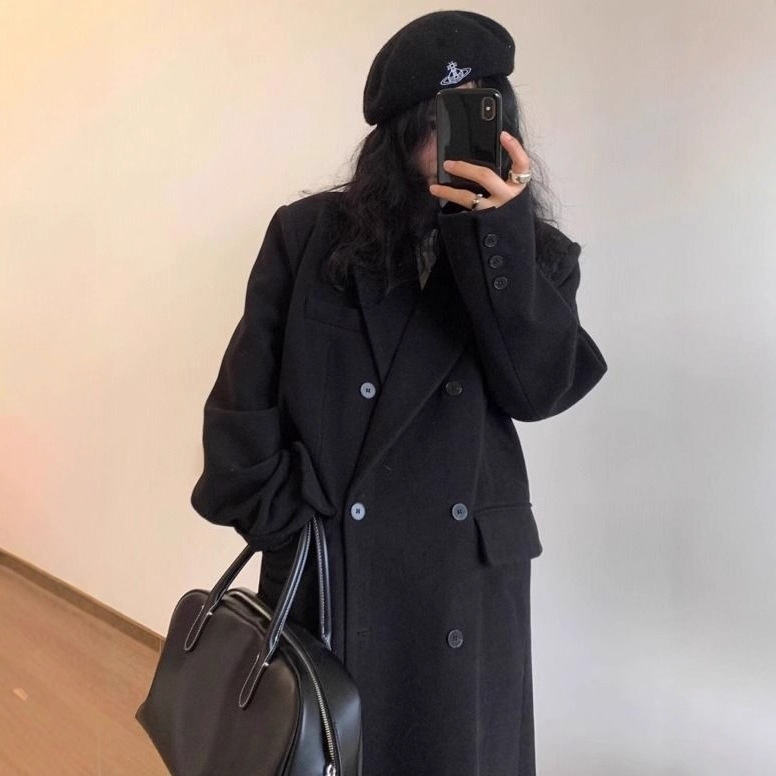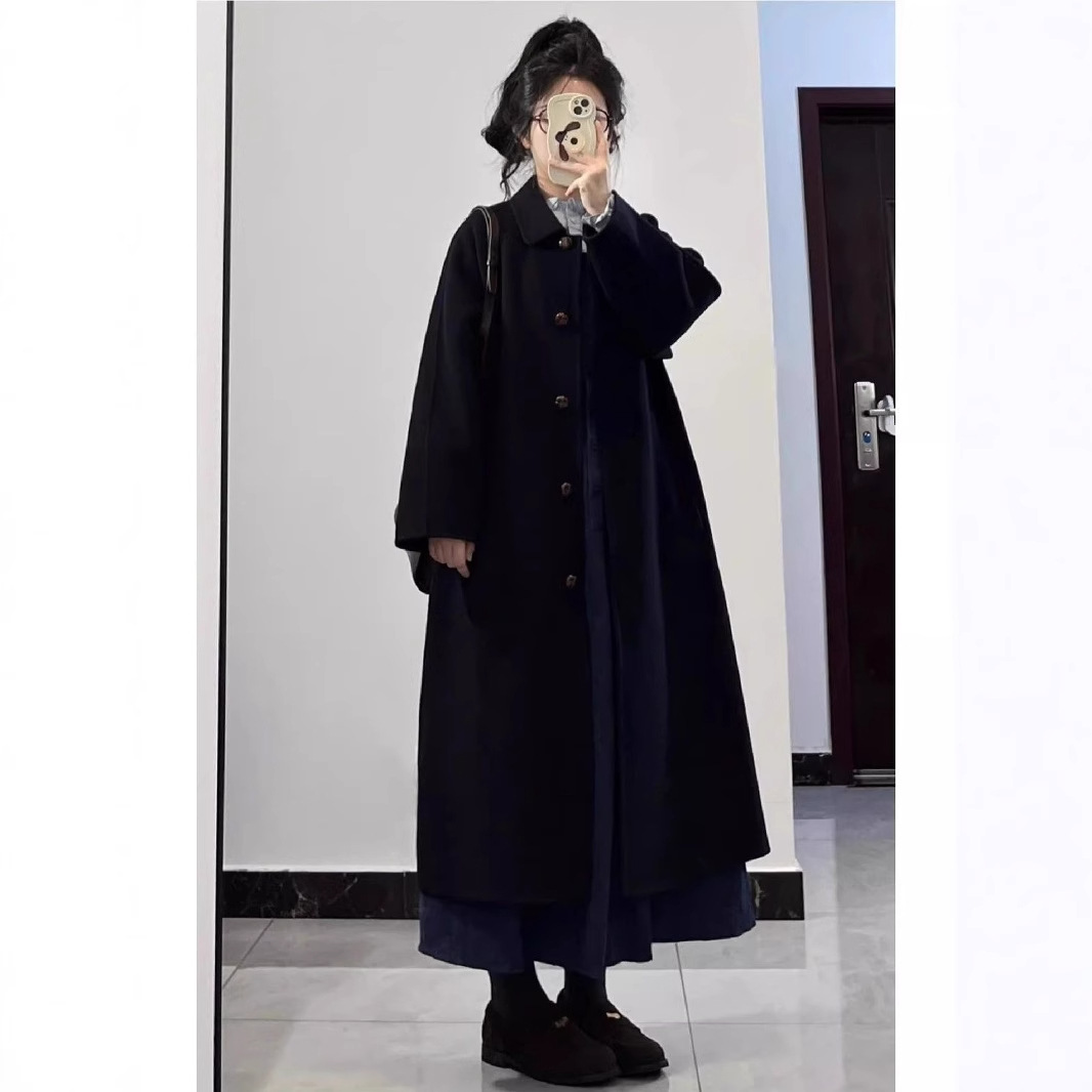 黒のウールコート女性のための 2025 秋と冬の新しいメイラード韓国ヘップバーンスタイル厚いウールコートトレンディ