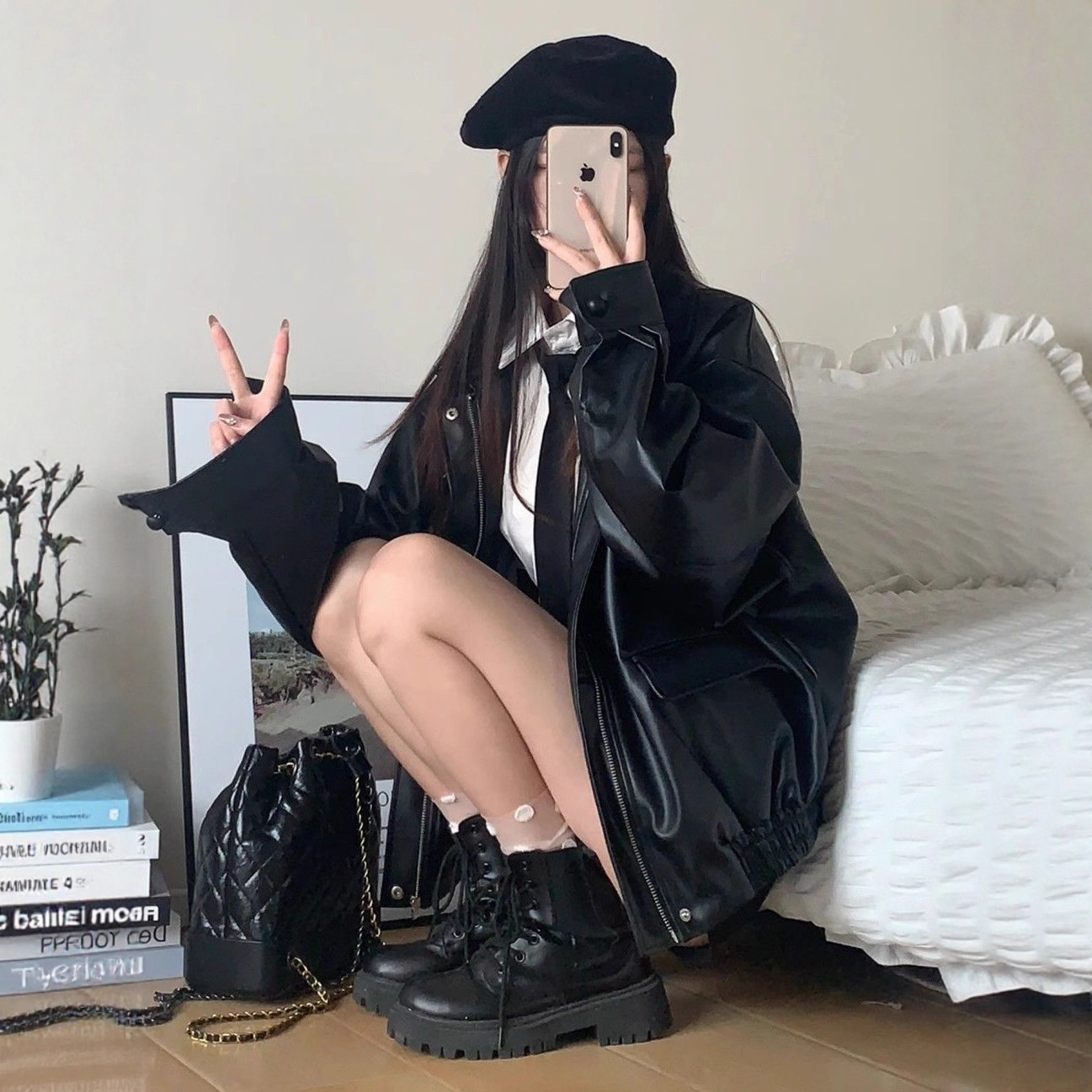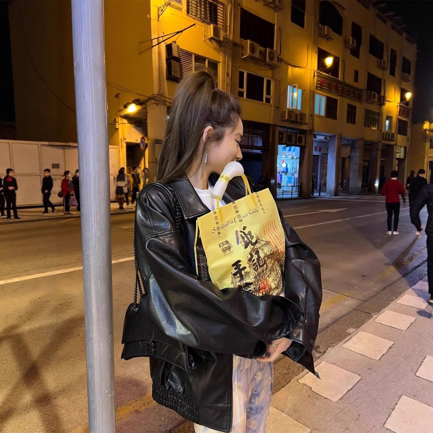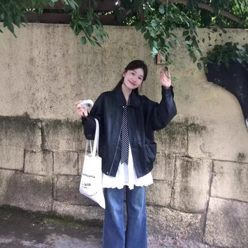 シンプルな黒のレザージャケット女性のための 2025 春と秋の新作ショートルーズカジュアル香港スタイルオートバイ pu ジャケットトレンディ