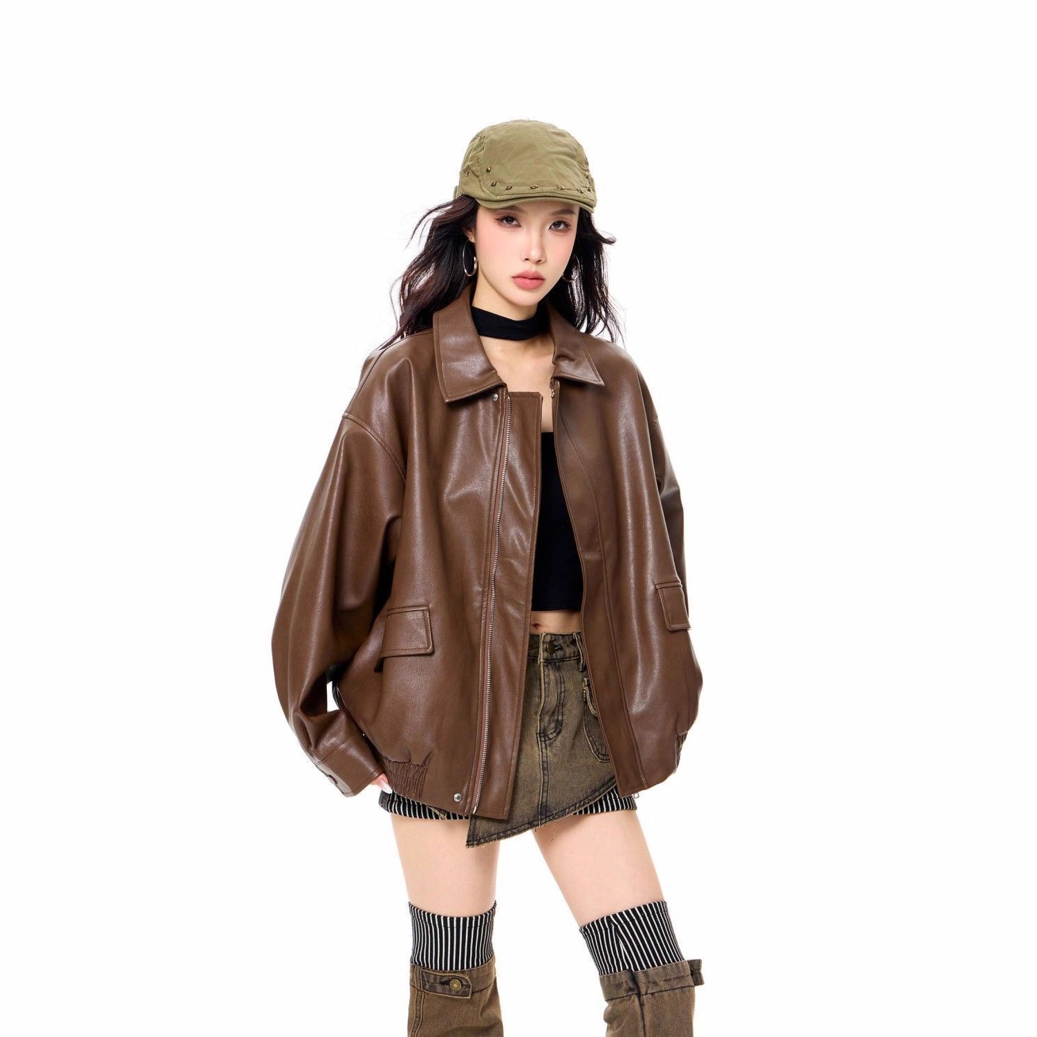 韓国スタイルのファッショナブルなシンプルなブラウンハイエンドレザージャケット女性のための 2025 秋の新しいオートバイスタイルのトレンディな PU ジャケット