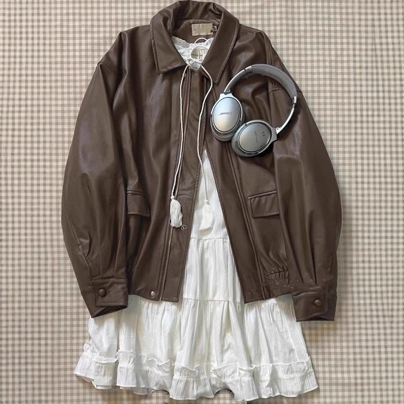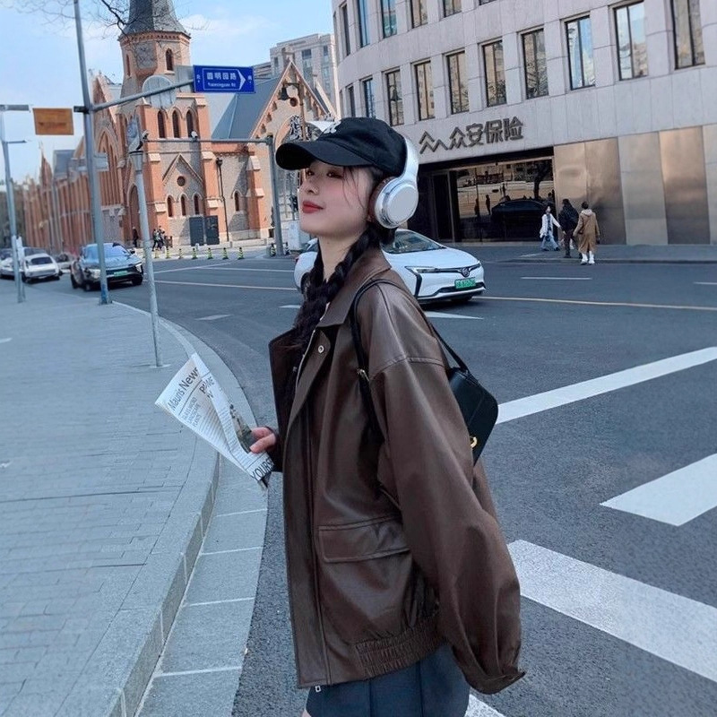 ブラウンレザージャケット女性のための 2025 春と秋の新しいスタイルの小さな香港スタイルのレトロなオートバイレザージャケットメイラードウェア