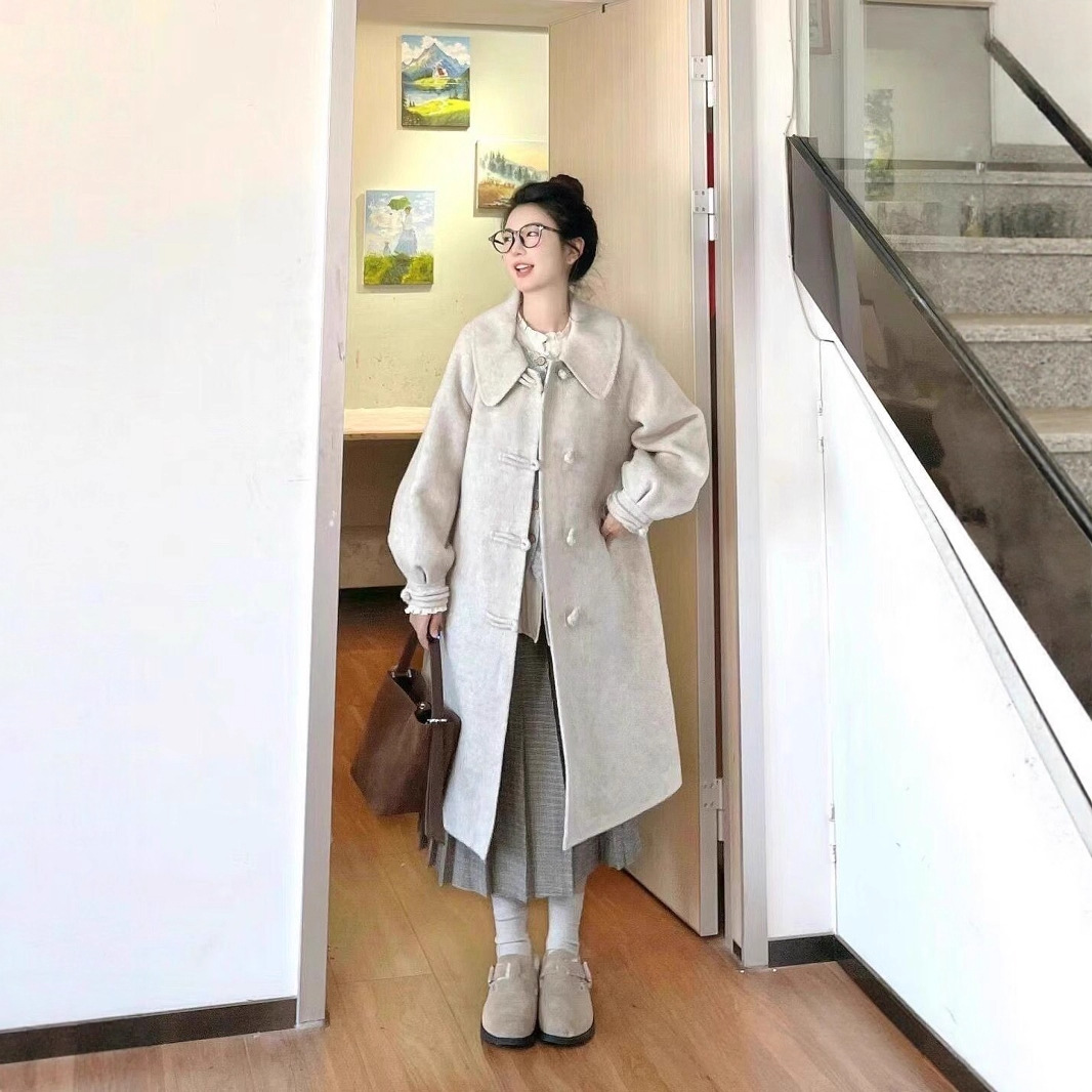 オートミールカラーカレッジスタイルコートミドル丈2025秋冬ベビーカラー冬ヘップバーン優しい小柄ウールコート