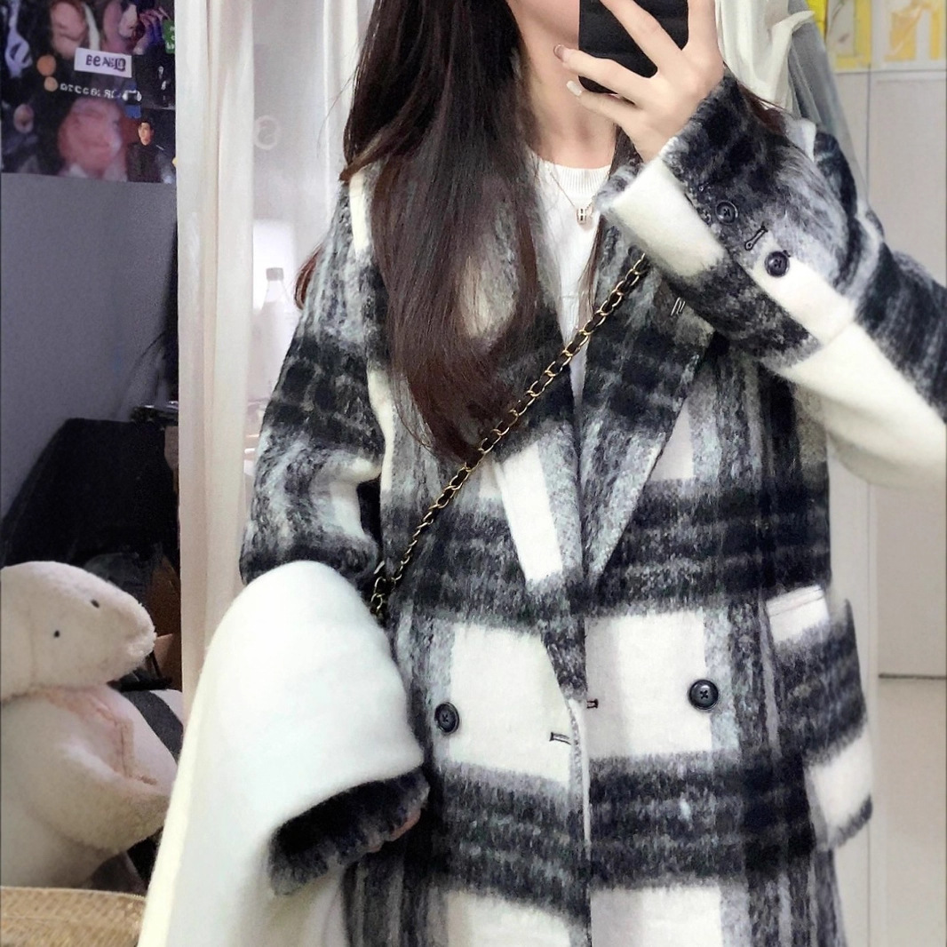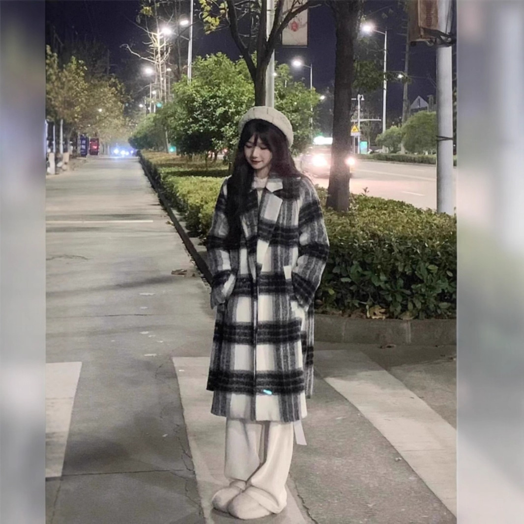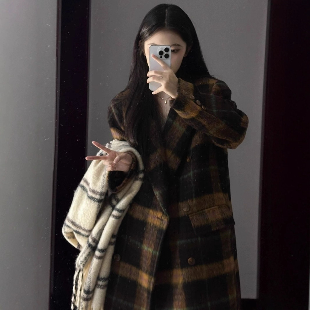 韓国チェック柄ウールコート女性のための 2025 秋と冬の新しいメイラードヘップバーンスタイル厚いウールコートトレンディ