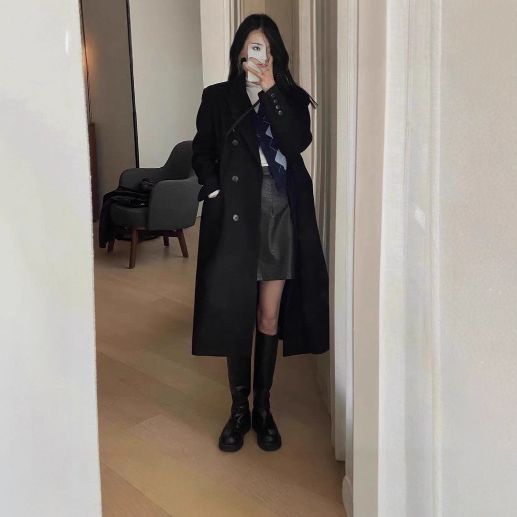 韓国ファッション黒ウールコート女性のための 2025 秋と冬の新しいメイラード人気のウールコート小柄な人向け