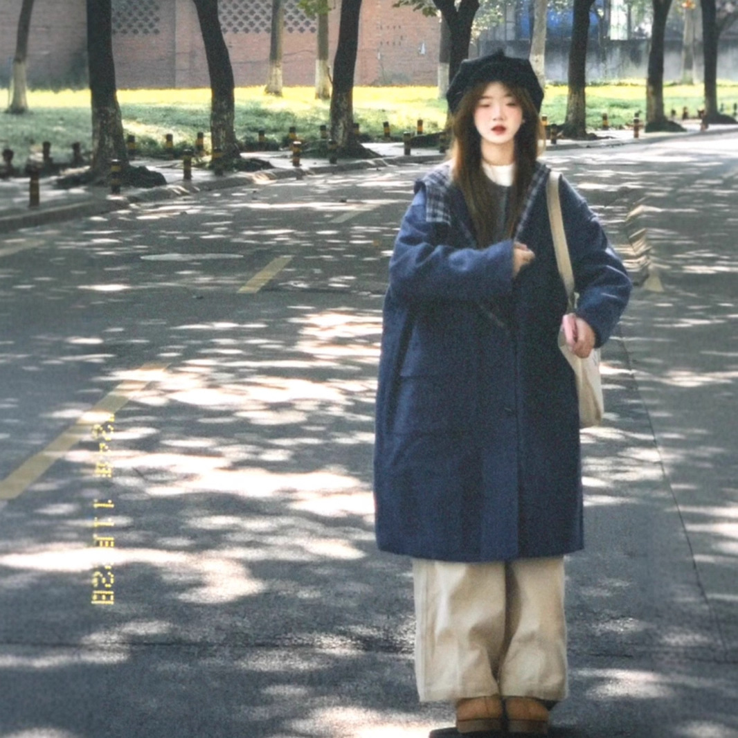 韓国のシンプルなホーンボタンウールコート女性のための 2025 秋と冬の新しいスタイルプラスベルベットのハイエンドのフード付きウールコートトレンディ