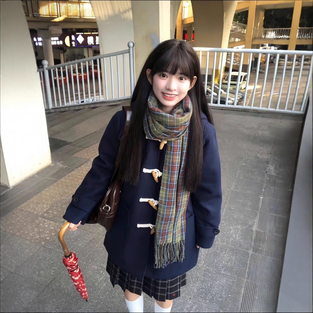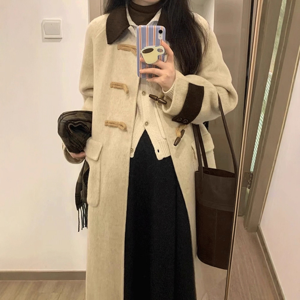 韓国ホーンボタンカジュアルウールコート女性のための 2025 秋と冬のカレッジスタイルのデザイン厚いウールコートトレンディ