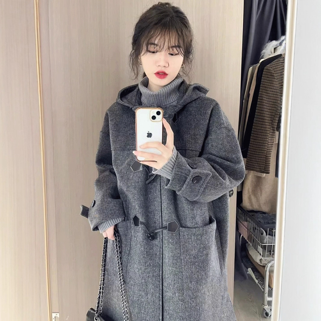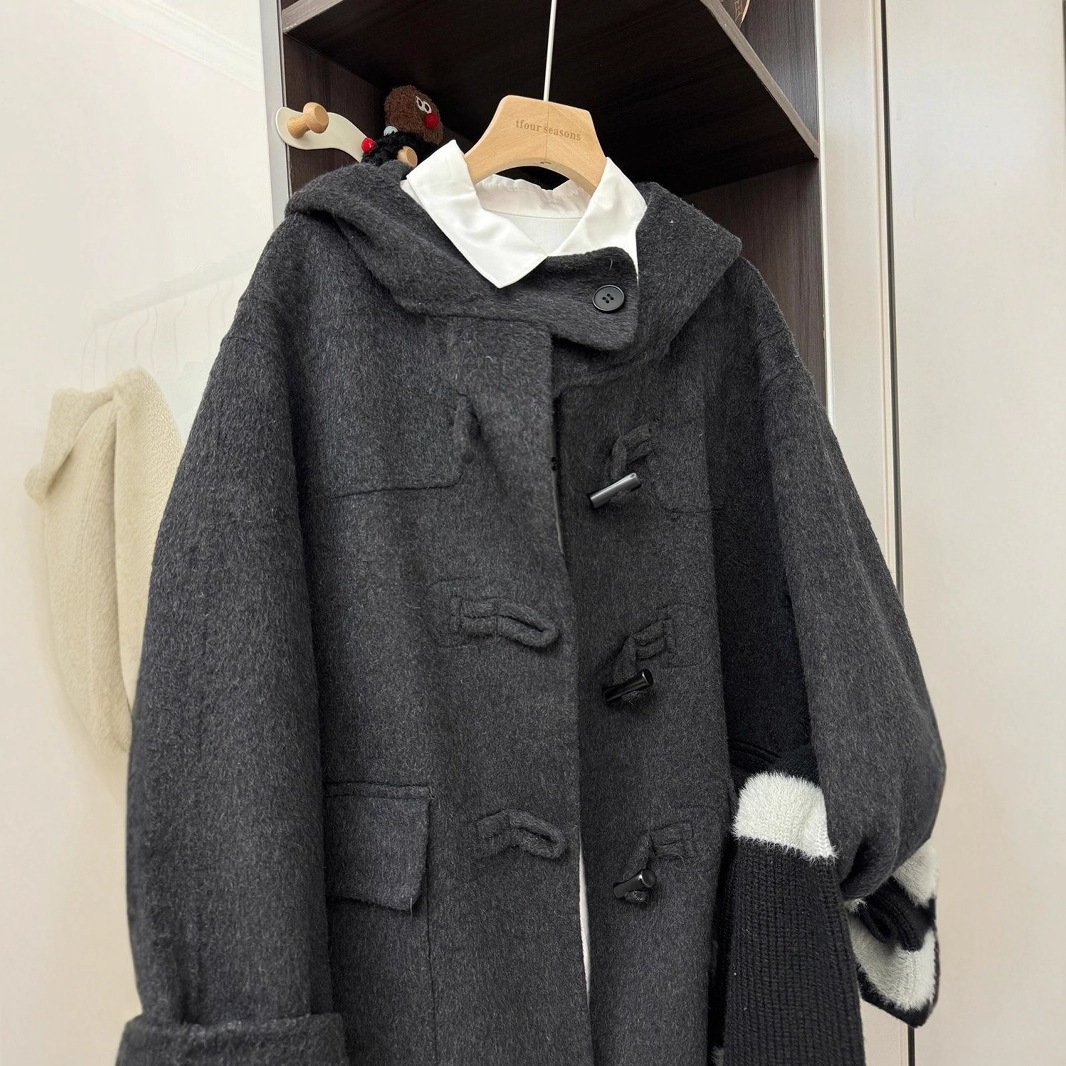 韓国版のシンプルなスタイルのホーンボタンフード付きウールコート女性用2025秋冬新作小柄なウールコートトレンディ