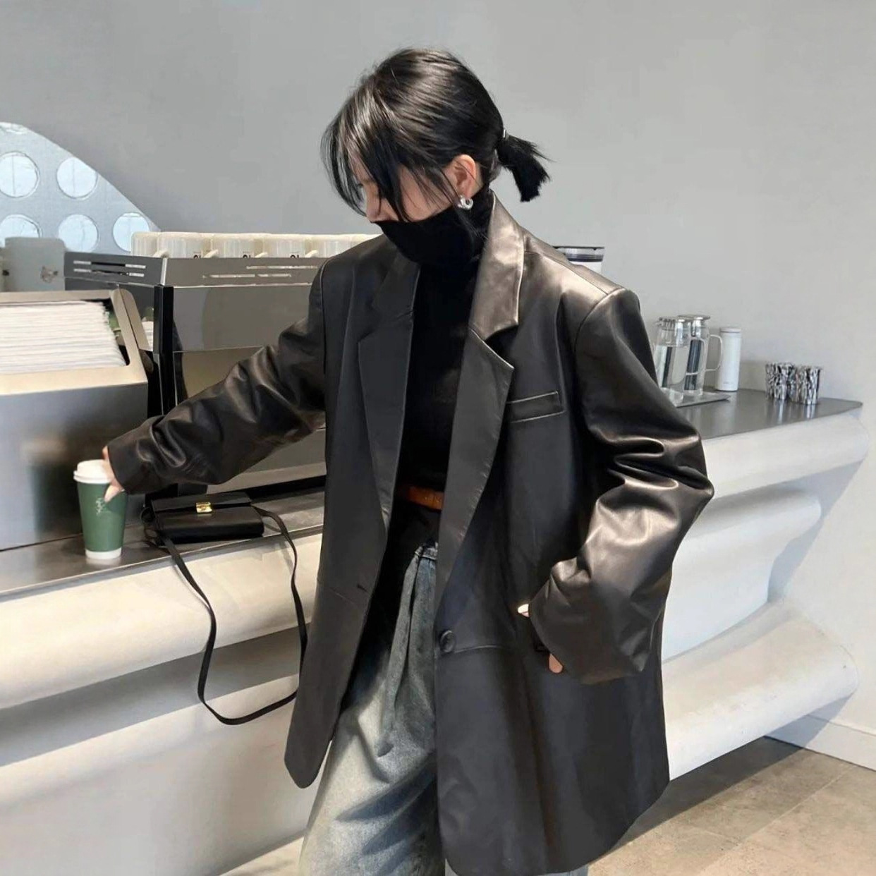 黒のファッショナブルなシンプルなハイエンドスーツレザージャケット女性のための 2025 秋の新しい多用途スリム PU 小さなスーツ