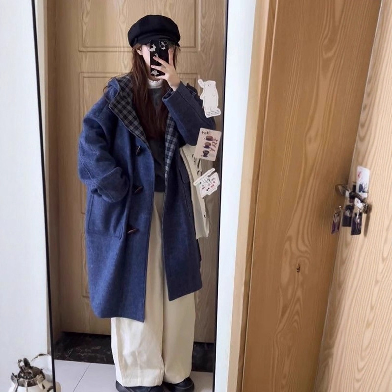 女性のためのハイエンドカジュアルブルーウールコート 2025 秋と冬の新しいヘップバーンスタイル韓国スタイルの厚いウールコートトレンディ