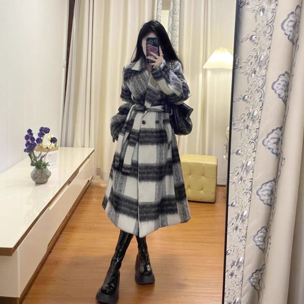 デザイン黒と白のチェック柄ウールコート女性のための 2025 秋と冬の新しい韓国ヘップバーンスタイル厚いウールコートトレンディ