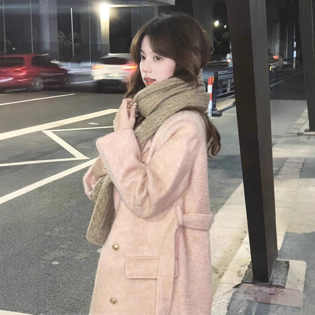 ピンクのウールコート女性のための 2025 秋と冬の新しいスタイルの優しい韓国スタイルのハイエンドヘップバーンスタイルの厚いウールのコート