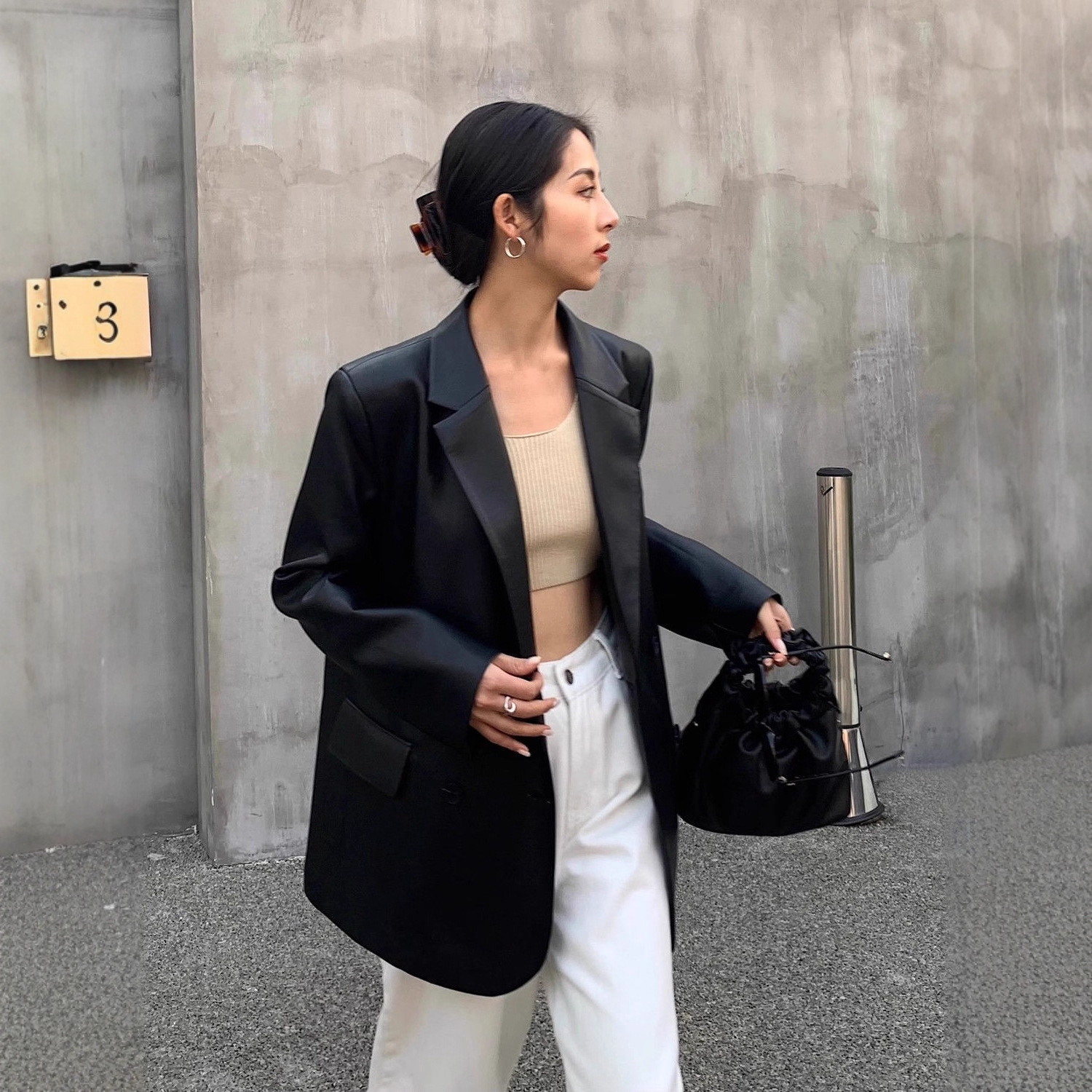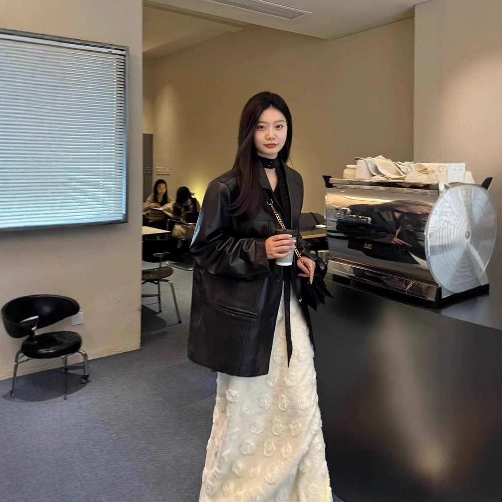黒のスーツレザージャケット女性のための 2025 秋の新アメリカンレトロデザインハイエンドルーズレザージャケットトレンディ