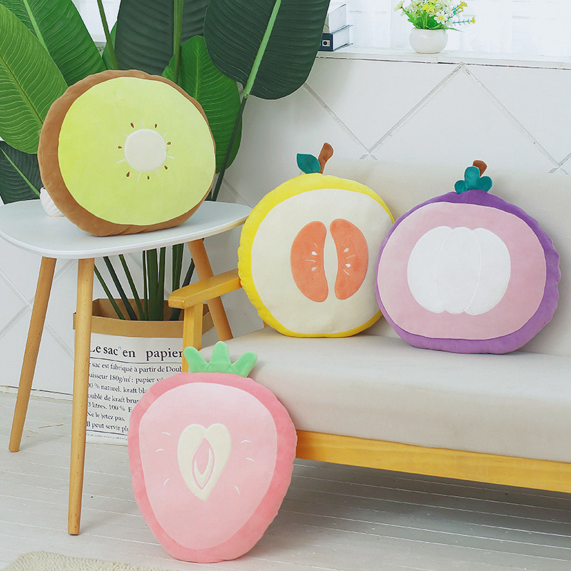 かわいい果物の形のぬいぐるみが枕を抱いています。