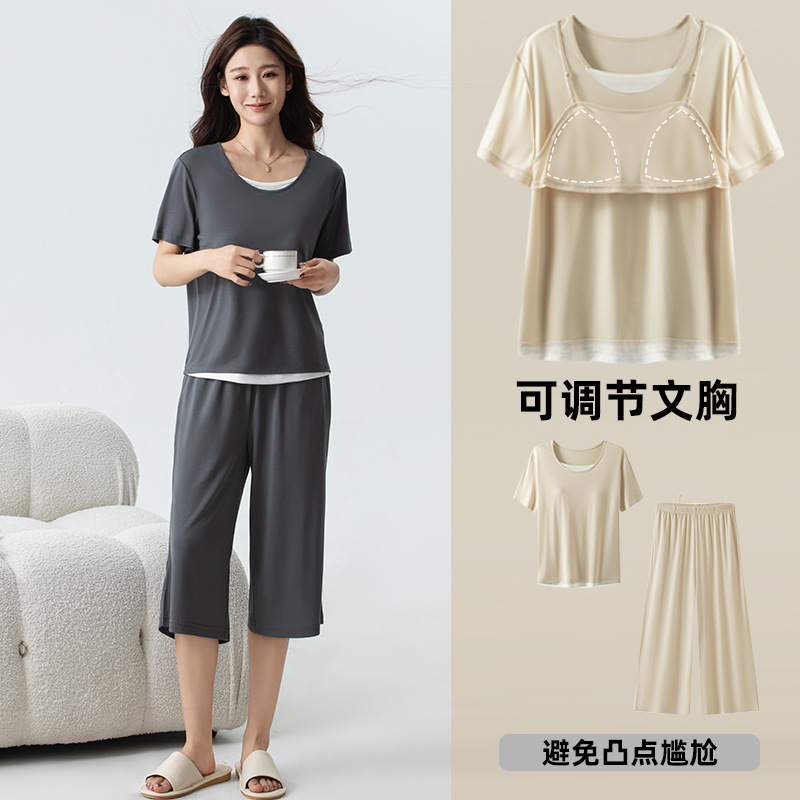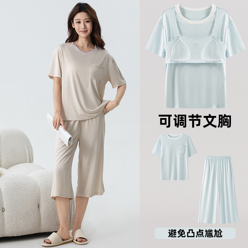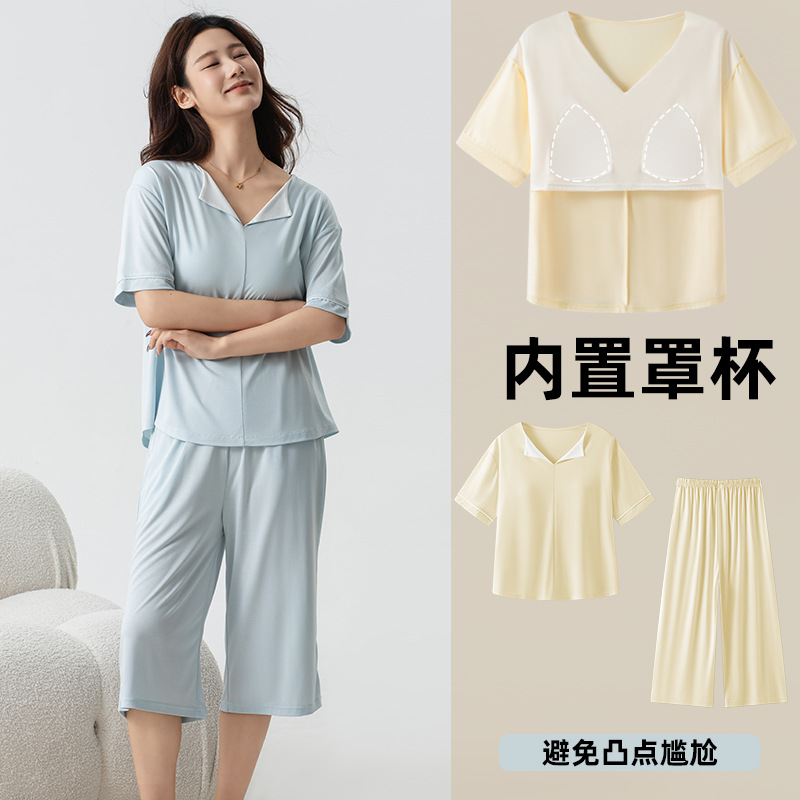 氷雲紗パジャマ女性は固定カップの偽二枚を調節でき、裾に丸みを帯びた七分ズボンセットZ153