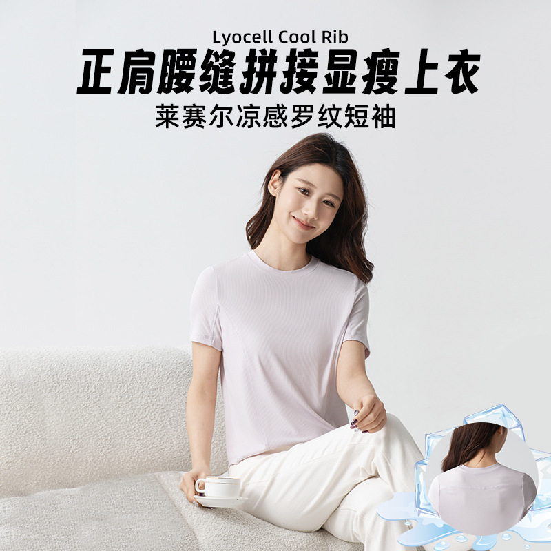 新商品のライゼル涼感リブ半袖tシャツ女性の肩の立体折れ線が痩せているアーチ形の上着L879