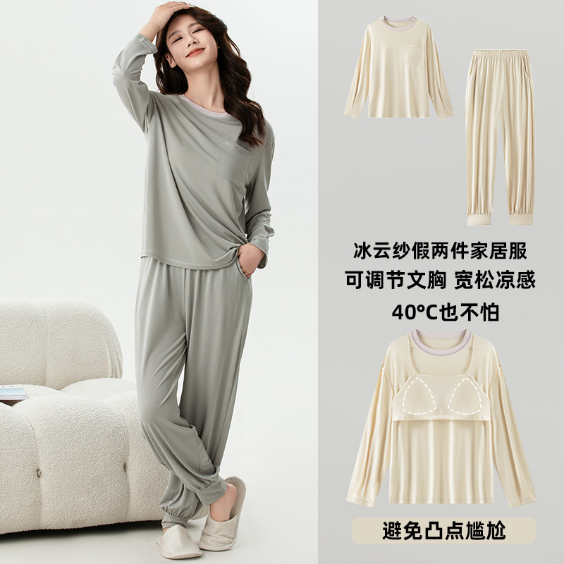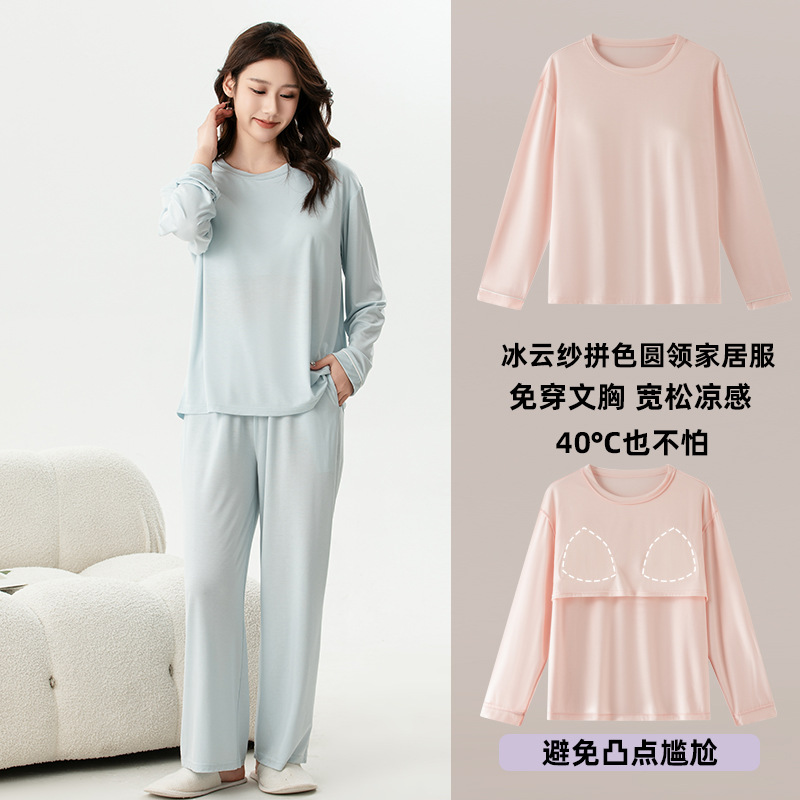 春夏の女性の氷雲のパジャマの丸首の長袖の白い盛り合わせの固定のカップは家の服のL874L863を着ることができます。