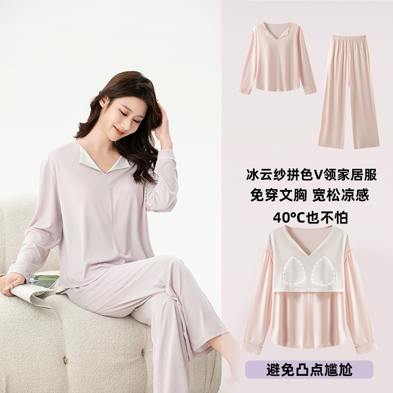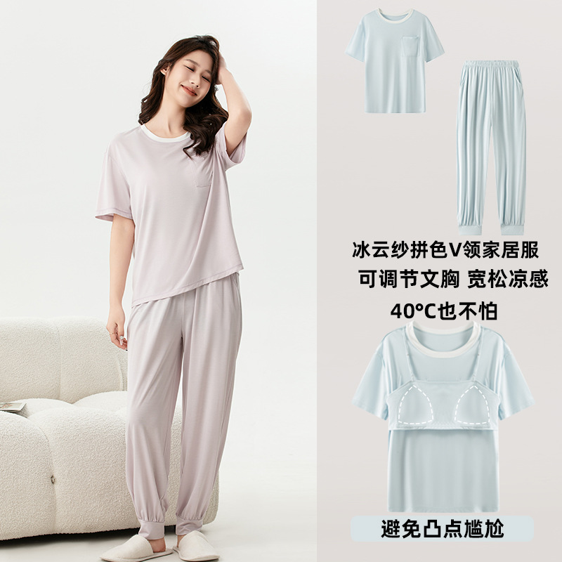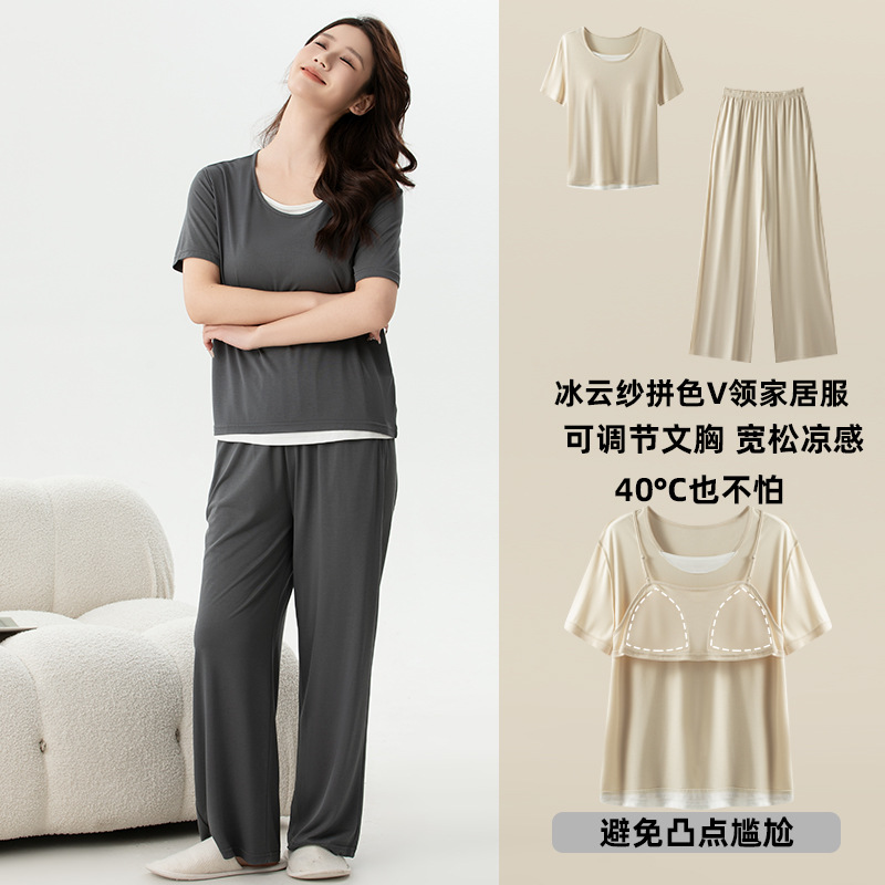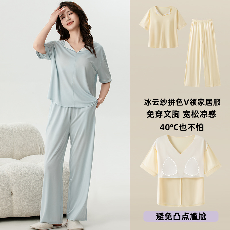 夏の女性の氷雲紗vネックの色合わせ半袖パジャマは固定カップを内蔵しています。