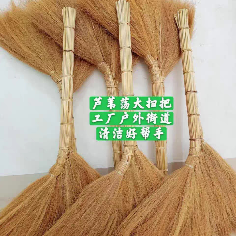 田舎の昔ながらの手編みの葦の厚い大きなほうき、長い柄、工場の遊び場、屋外の街路、家庭用オフィスビル