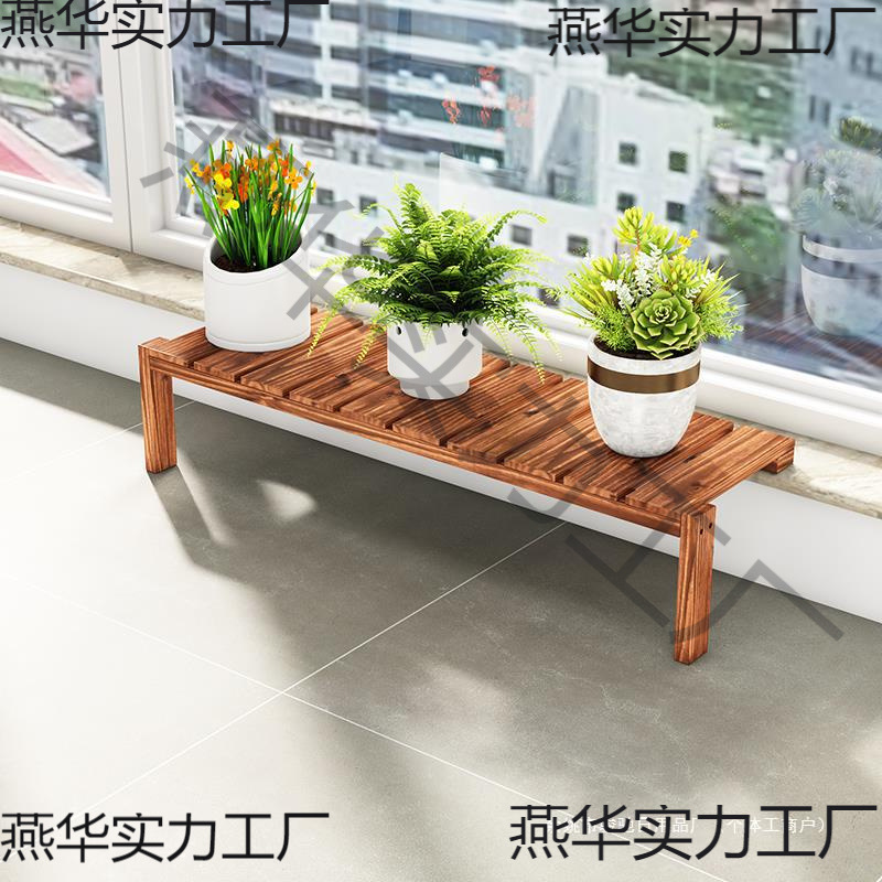バルコニーの窓枠の幅広めのフラワーラック無垢材の床置き単層幅広植木鉢棚高低脚収納ラック