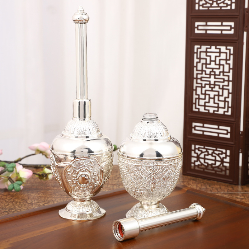 ヨーロッパ式の銀色の電気めっきの美しい模様の聖水瓶の軽い豪華な風の高級な家庭の事務室のデスクトップの工芸品の置物