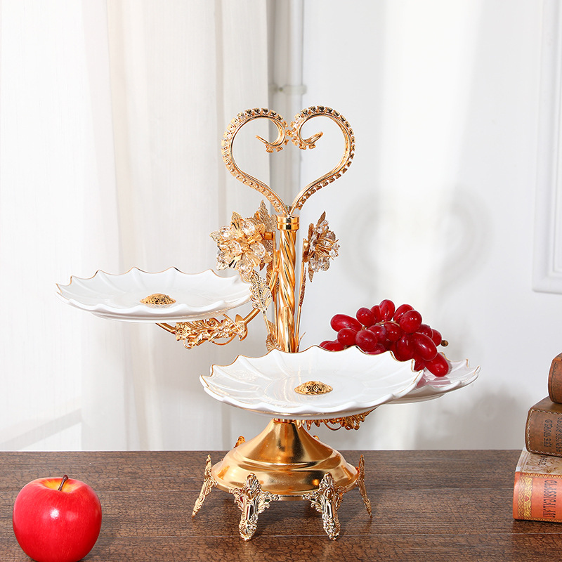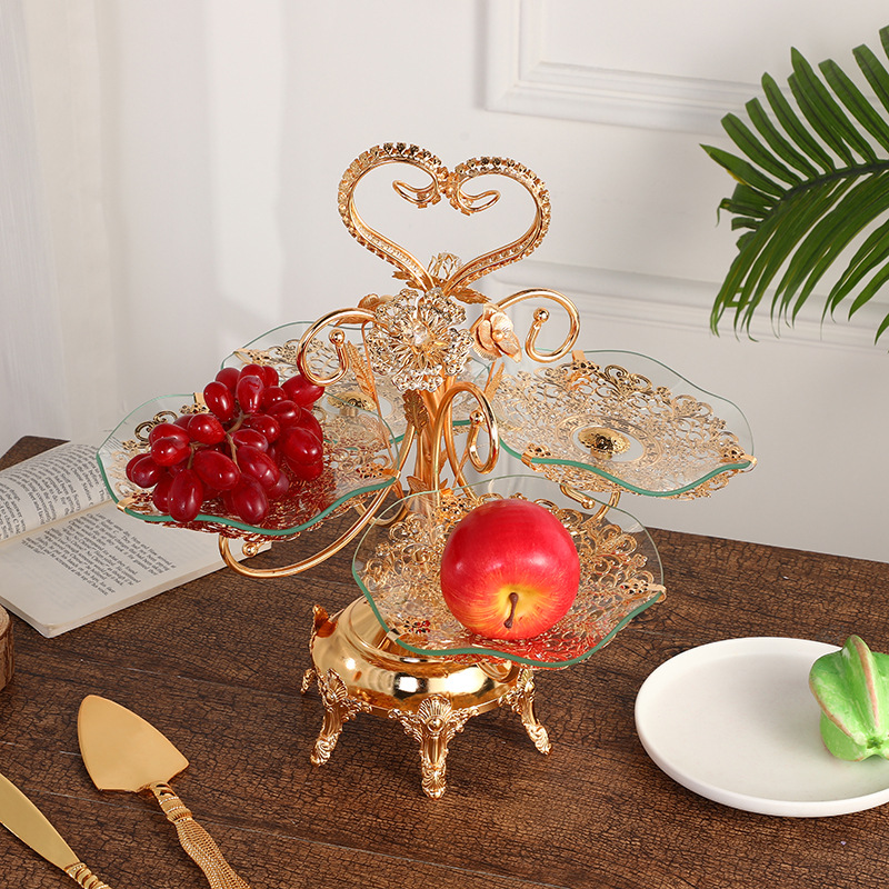 ヨーロッパ式の軽い豪華な多層の手提げ果物皿家庭用ビジネスリビングルームのデスクトップの置物の高級感のある美しいデザインの果物皿