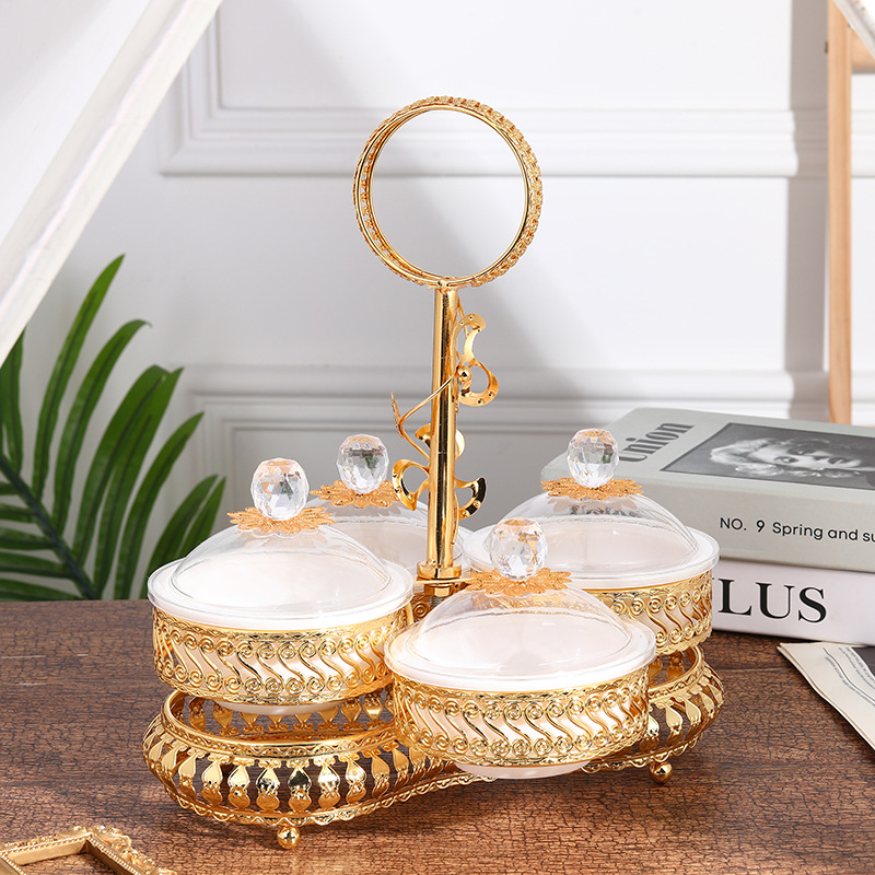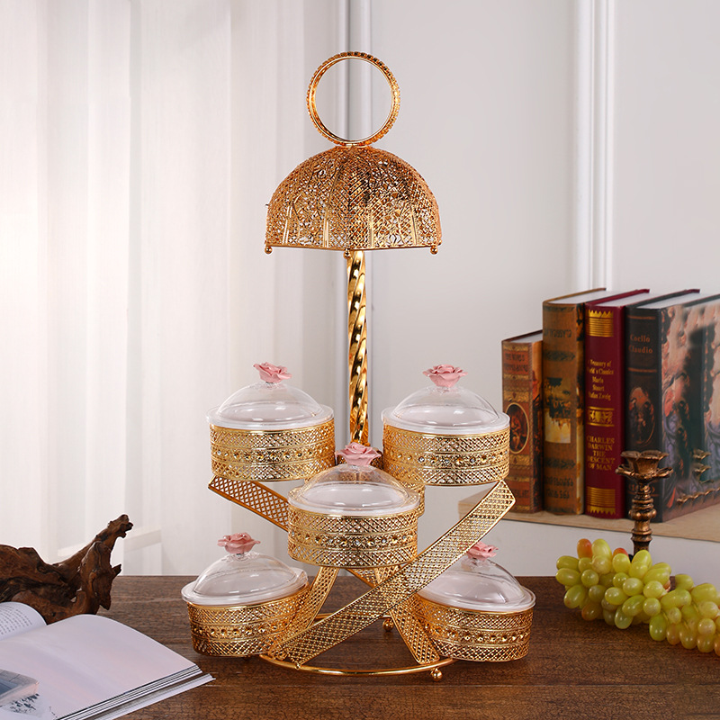 ヨーロッパ風の復古風の金色の模様の果物の箱の高級感の5格の精巧な果物の乾果のアクリルの合金の果物のかご