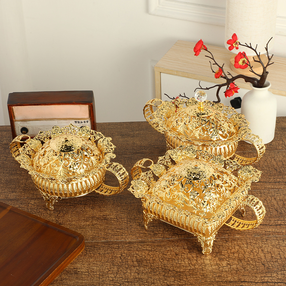 ヨーロッパ風の透かし彫りの蓋付き果物皿家庭用の軽い豪華な金色の鉄芸のドライフルーツ皿結婚式のホテルの工芸品の置物