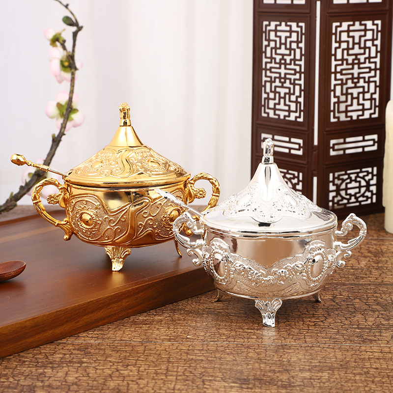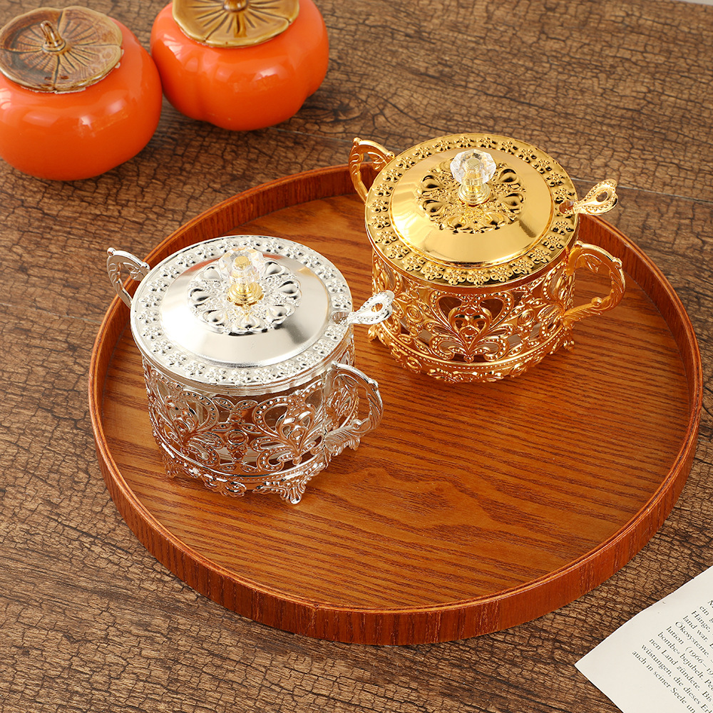 ヨーロッパの砂糖の杯のアイデアのファッションの砂糖の杯の調味料の瓶のレストランの台所の日用品の金の銀色の花のあめ