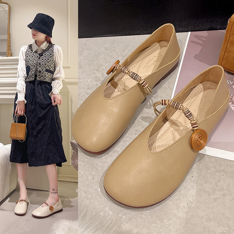 柔らかい皮の柔らかい底の快適なメアリージェーンの靴の女性2025春の新しい夜の風の優しい平底の復古の豆の靴