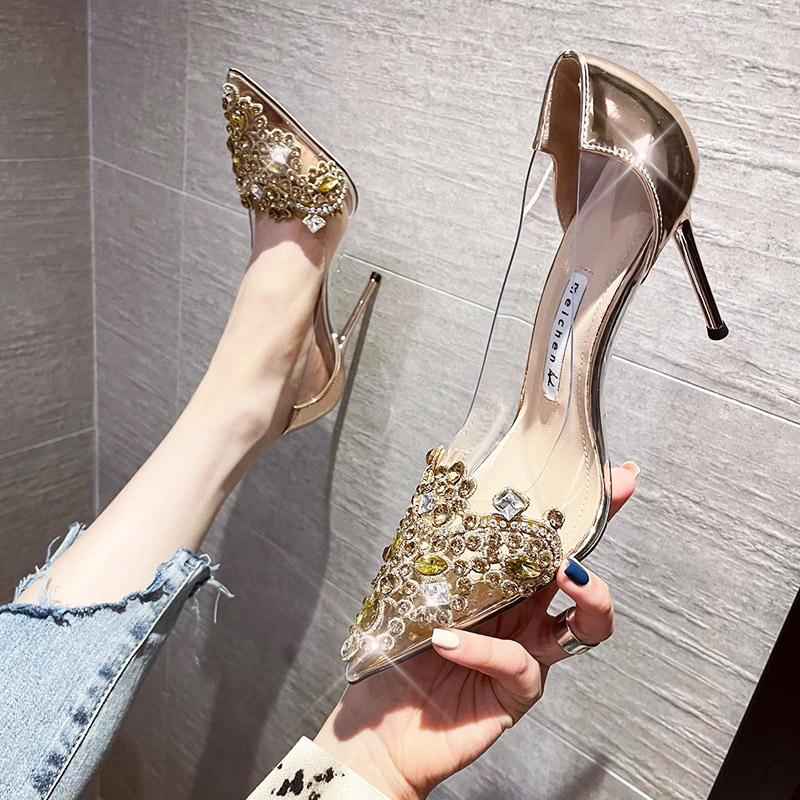 2025年の春の新型ハイヒールの女性の細いつばの先の水晶のドリルの復古的な透明な花嫁の結婚靴の靴の靴
