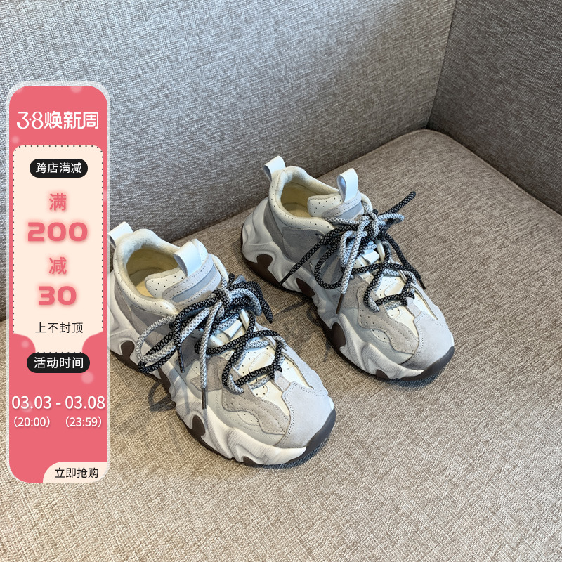 ネット赤のお父さんの靴の女性ins潮2025春の新型の厚い底の本革は足の小さい運動のカジュアルシューズの女性を見せます。