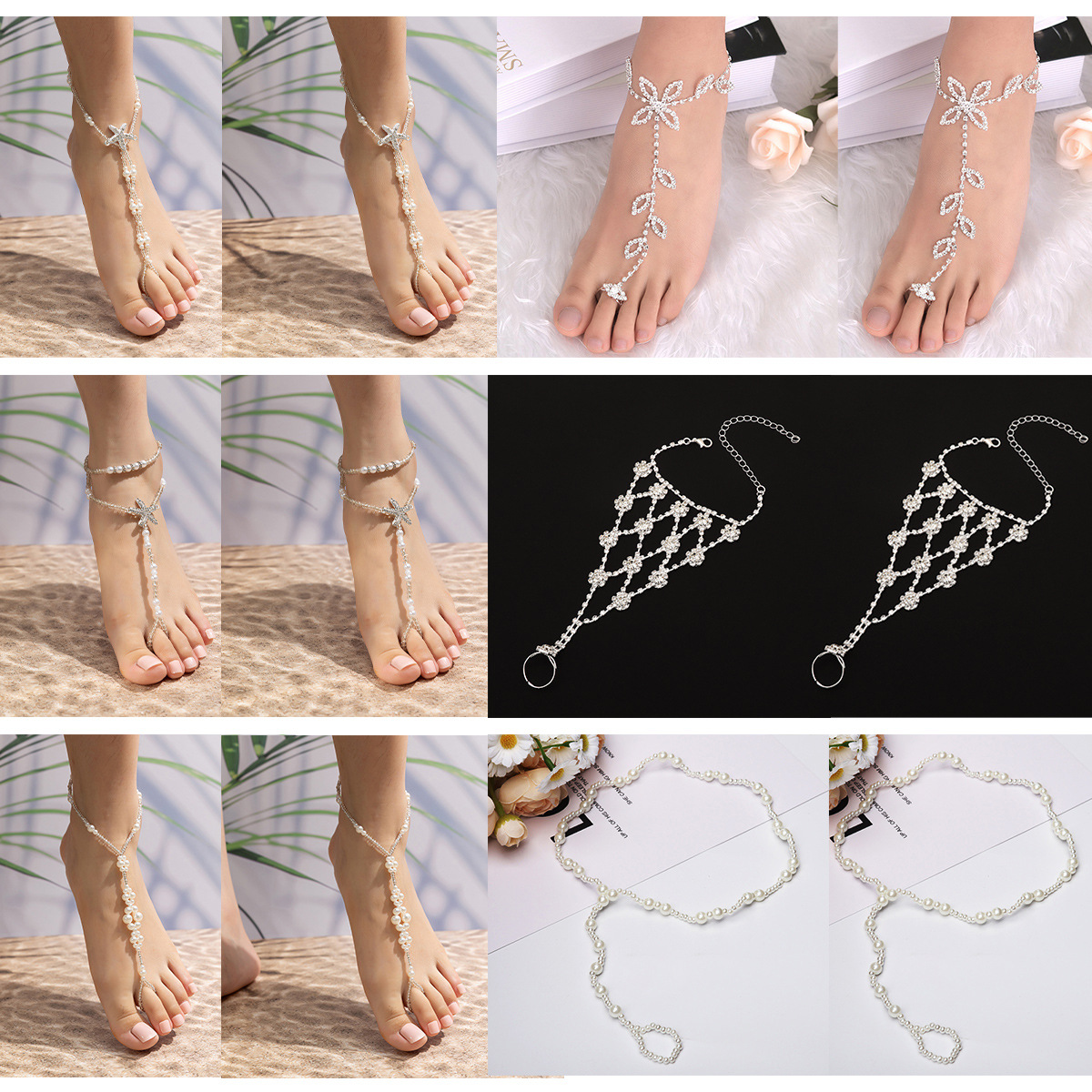 欧米のクロスボーダーのフラッシュドリルの海星の白い真珠の足のチェーンの水ドリルの足のチェーンのビーチの足のチェーンの光の足の装飾の12個のセット