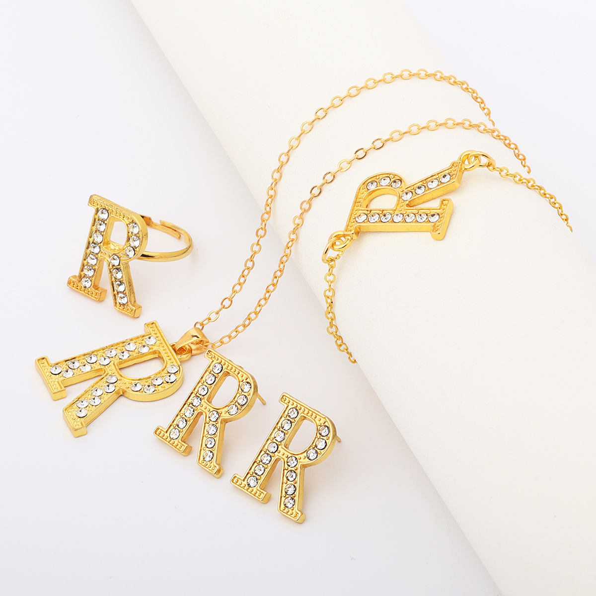 国境を越えて起爆したアルファベットのネックレスは個性的で贅沢で、英語のペンダントに合った指輪の鎖のイヤリングの4セットを飾っている