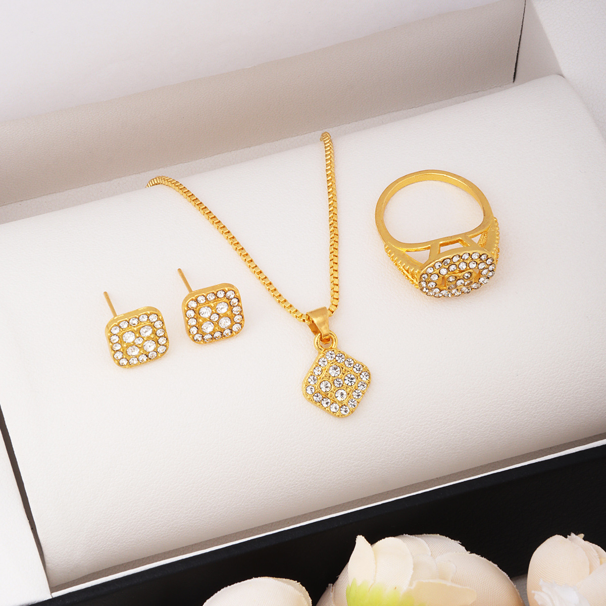 合金クロスボーダーライト高級ダイヤモンド幾何学ネックレスリングイヤリング 3 点セットファッショナブルでシンプルな多用途ジュエリーセット