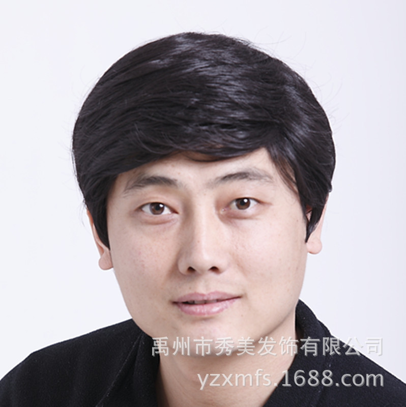 男性のかつらは本当に短い髪をしています。お父さんの新しい髪は男性のかつらをセットしています。