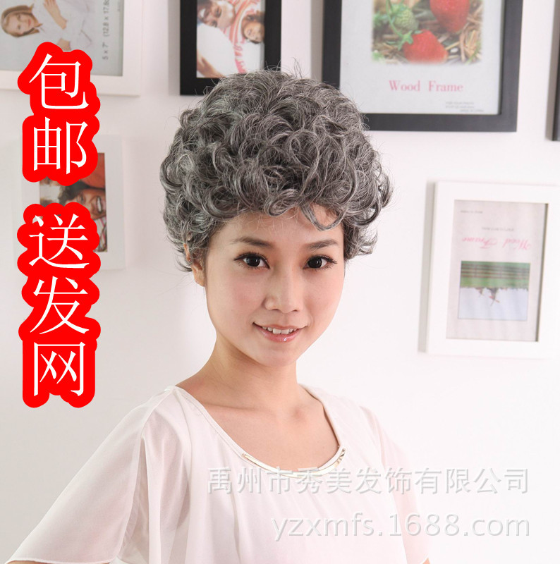 本物の髪のかつらのショートヘアの短いカールの中高年のかつらのお母さんのかつらの高齢者のかつら
