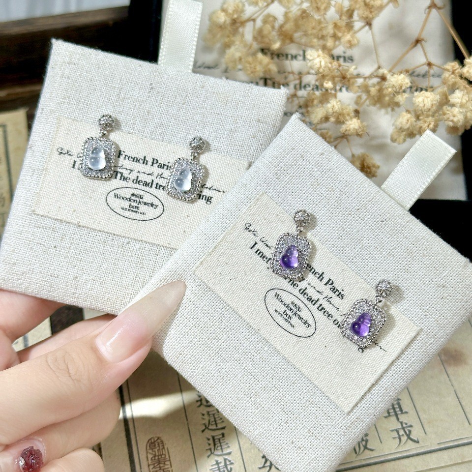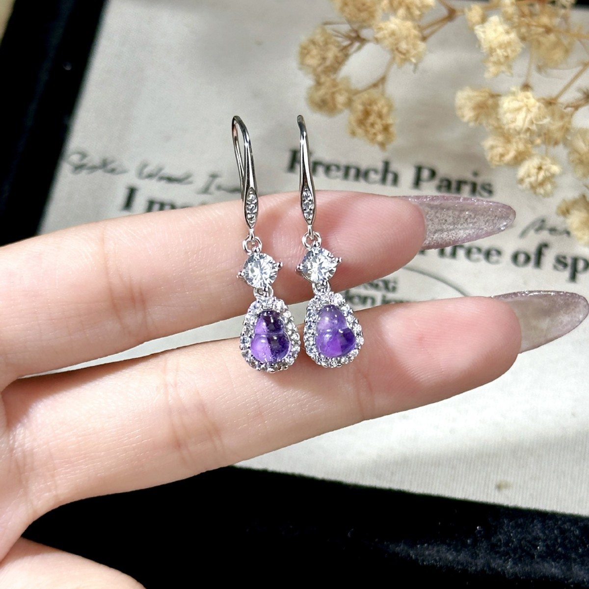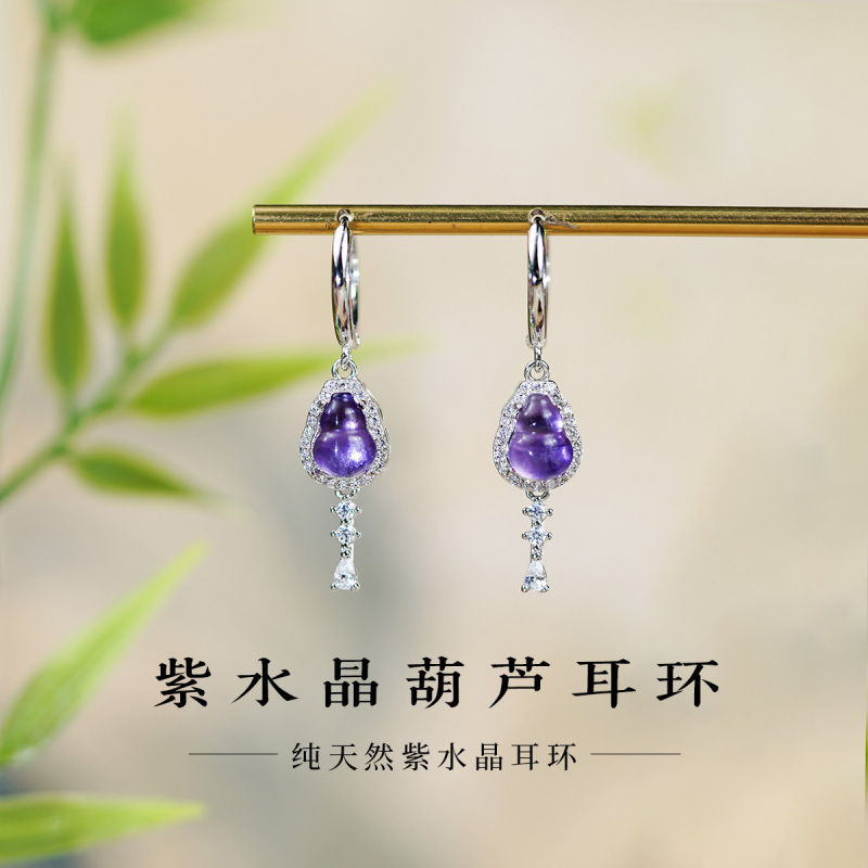Xiaohongshuの人気の天然アメジストの祝福と幸福のひょうたん紫気東来タッセルイヤリング象嵌レディースニッチイヤリング