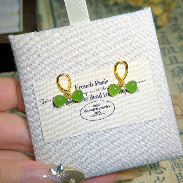 女性用リボンイヤリング、翡翠碧玉、スターリングシルバー、高級レディースレトログリーンイヤリング、イヤリング、ジュエリー