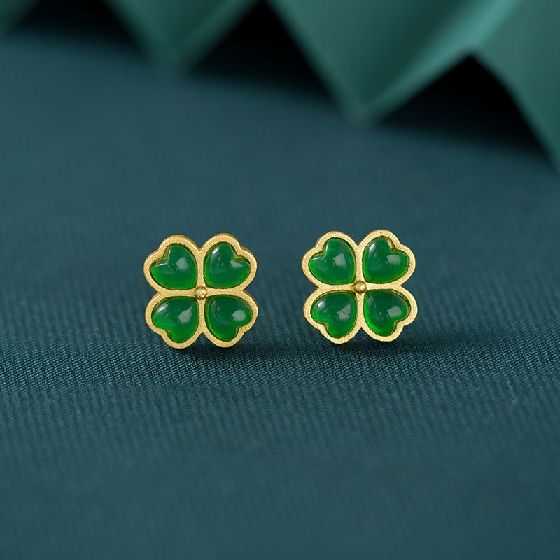 レトロファッション、軽やかな高級感、模造和田碧玉の四つ葉のクローバーイヤリング、女性用、S925シルバーピン、シンプルでエレガントなイヤリング