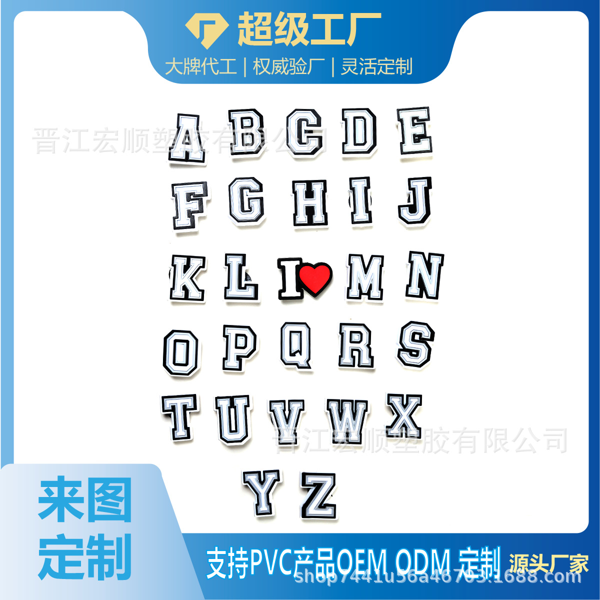 黒と白の灰色の英語のアルファベットの数字のセットの穴の靴の花の靴のボタンのPVCの靴の装飾のDIYは国境を越える現物を飾ります。