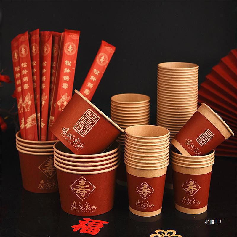 厚みのあるお祝いの赤い祝福と長寿の文字の紙コップと紙ボウル、高齢者の誕生日宴会、使い捨て食器、ボウルと箸