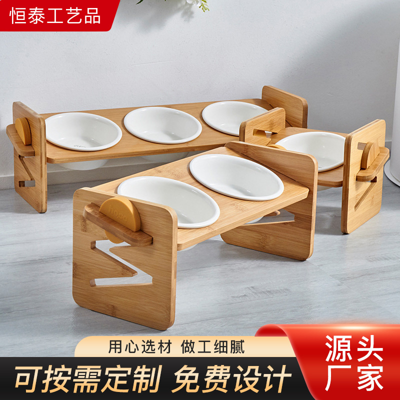 ペット用給餌スタンド セラミックボウル 猫と犬用 斜めの口で頸椎を保護 キャットフードボウル ペット用調節可能な竹製スタンド 猫と犬用