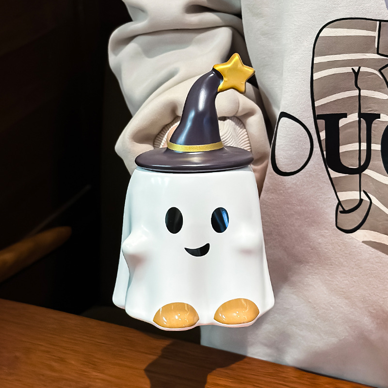 帽子クリエイティブかわいい猫マグカップ蓋付き幽霊カップ女子陶磁器高颜値漫画家庭用コップ