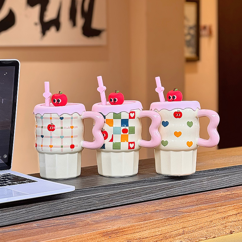 可爱苹果陶瓷杯带盖高颜值情侣马克杯女生家用办公室硅胶吸管水杯